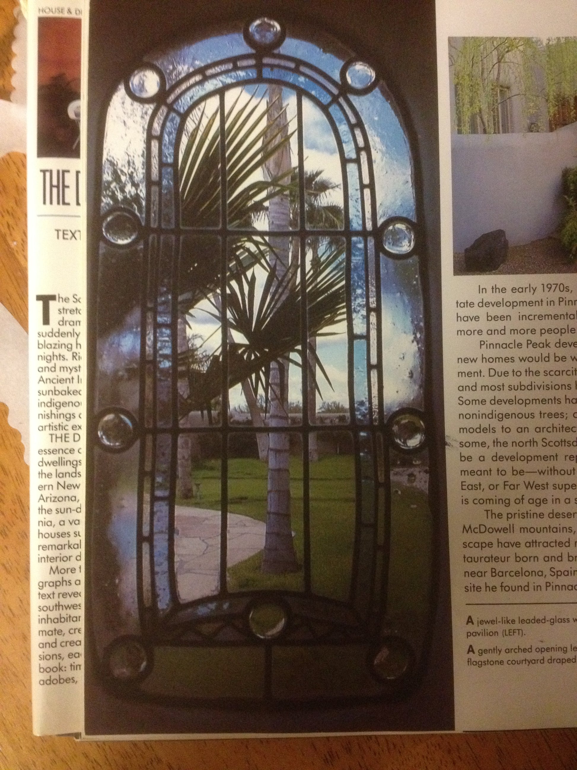 This stunning stained glass door was inspired by our favorite book, The Desert Southwest, by Nora Burba and Paula Panich, with photographs by Terrence Moore. On page 174, we discovered a beautiful window from an Adobe Home designed by Architect William Tull in 1980 in Scottsdale, Arizona.