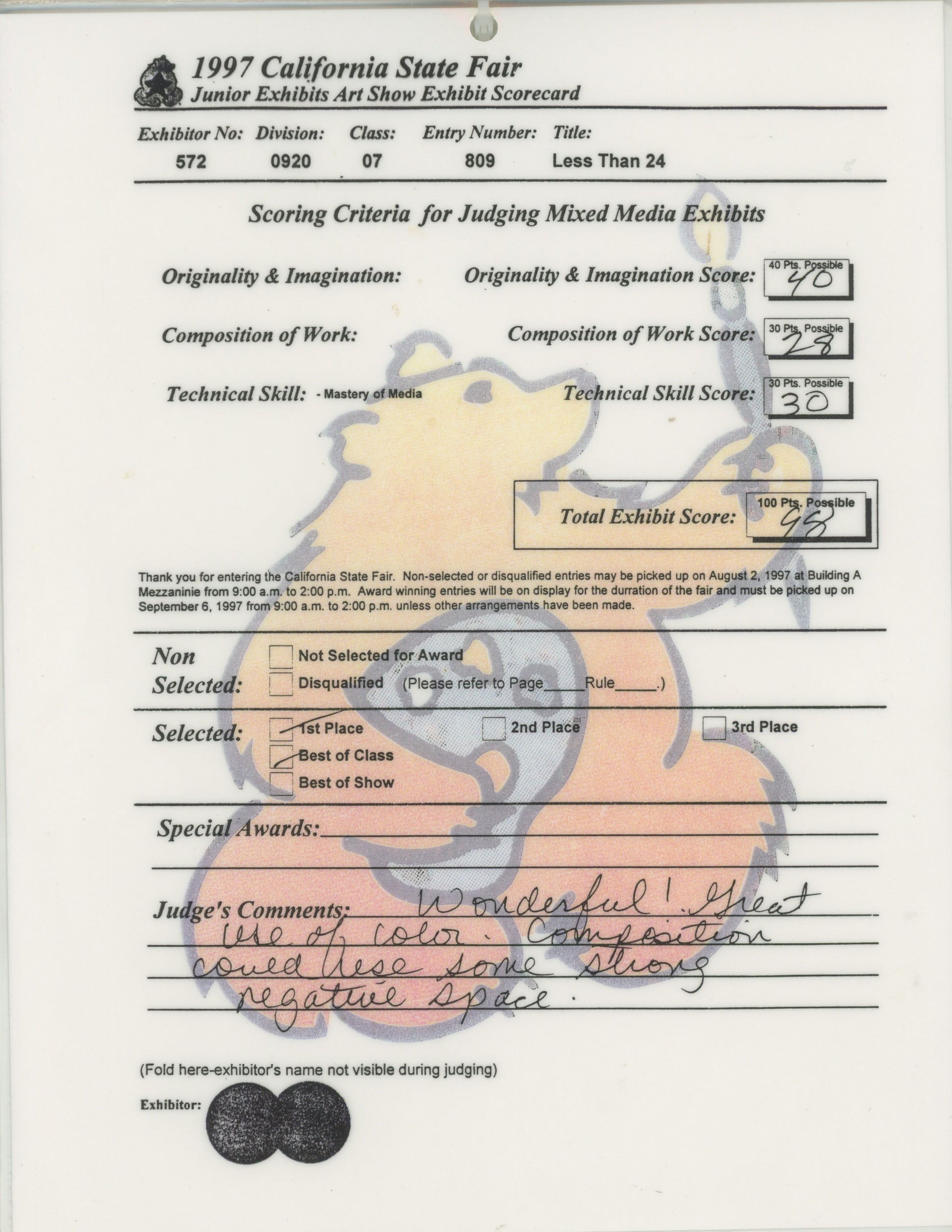 1997: The legendary "Less Than 24" - scoring an extraordinary 99/100 with perfect scores in Originality & Imagination (40/40) and Technical Skill (30/30), earning "Best of Class" for ages 10-13