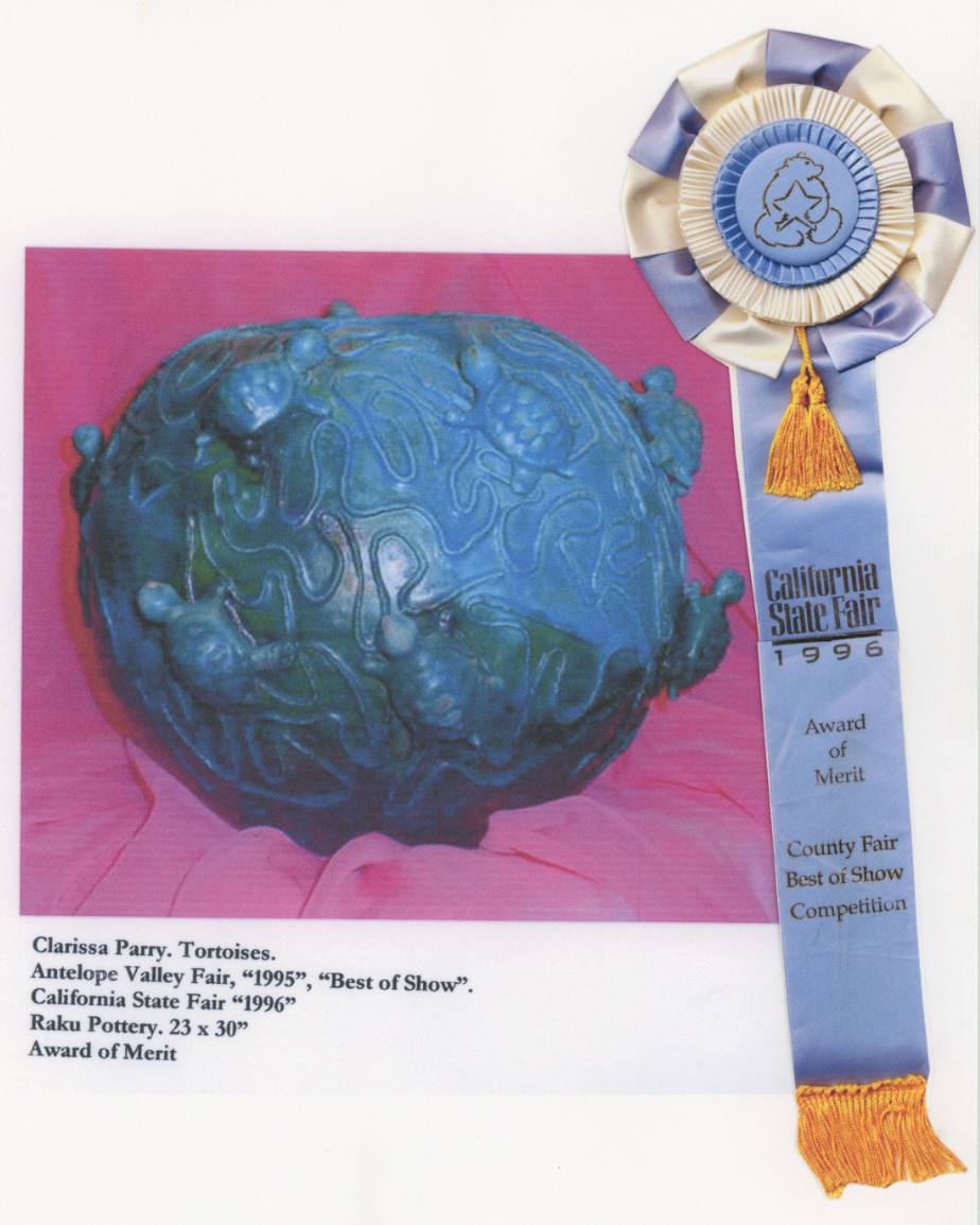 1996: Double victory with Raku Pottery masterpieces including "Tortoises" (Award of Merit) and "Big Fun Ferris Wheel," There were 1,150 entries and only 170 were selected for display in the exhibit.