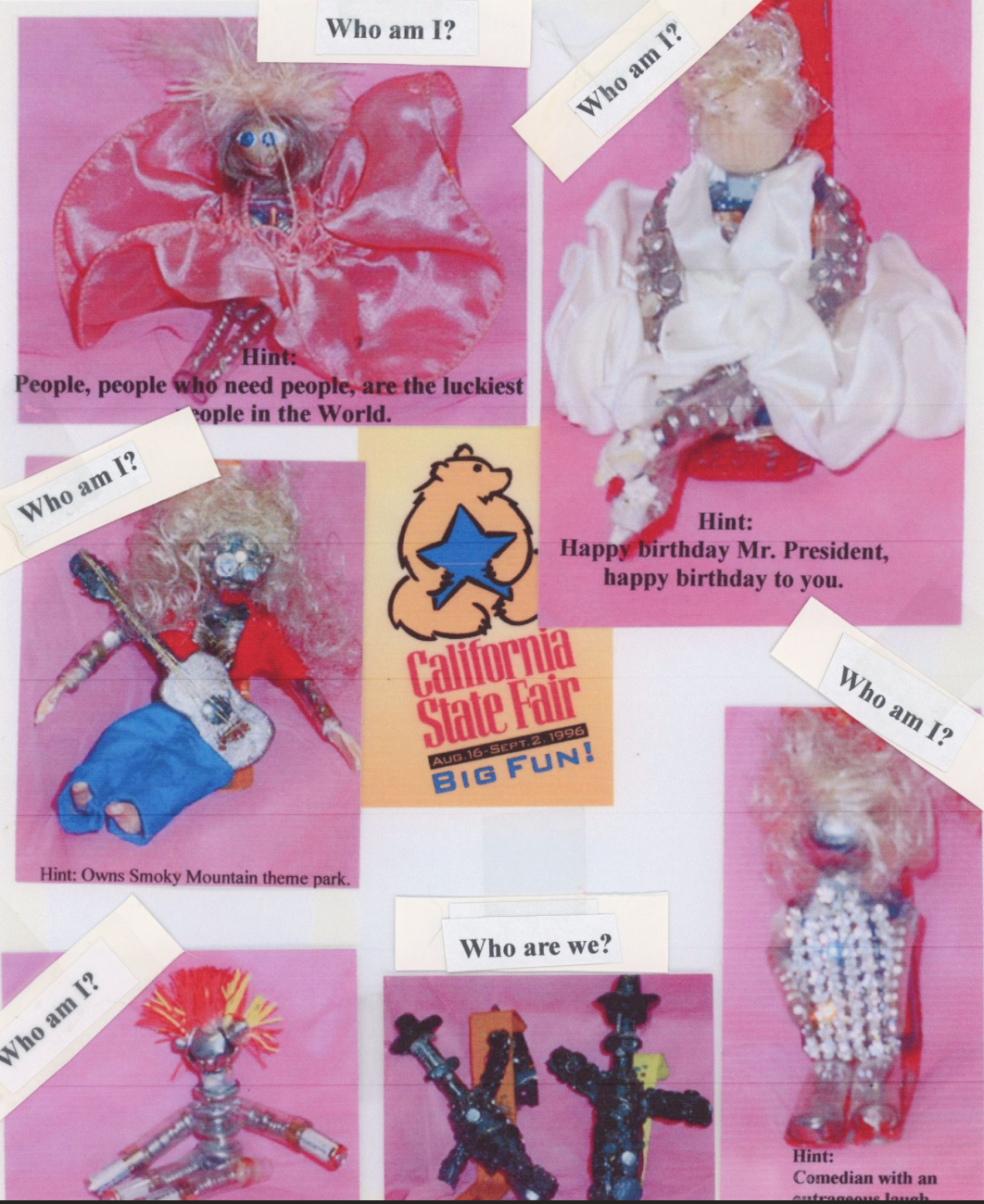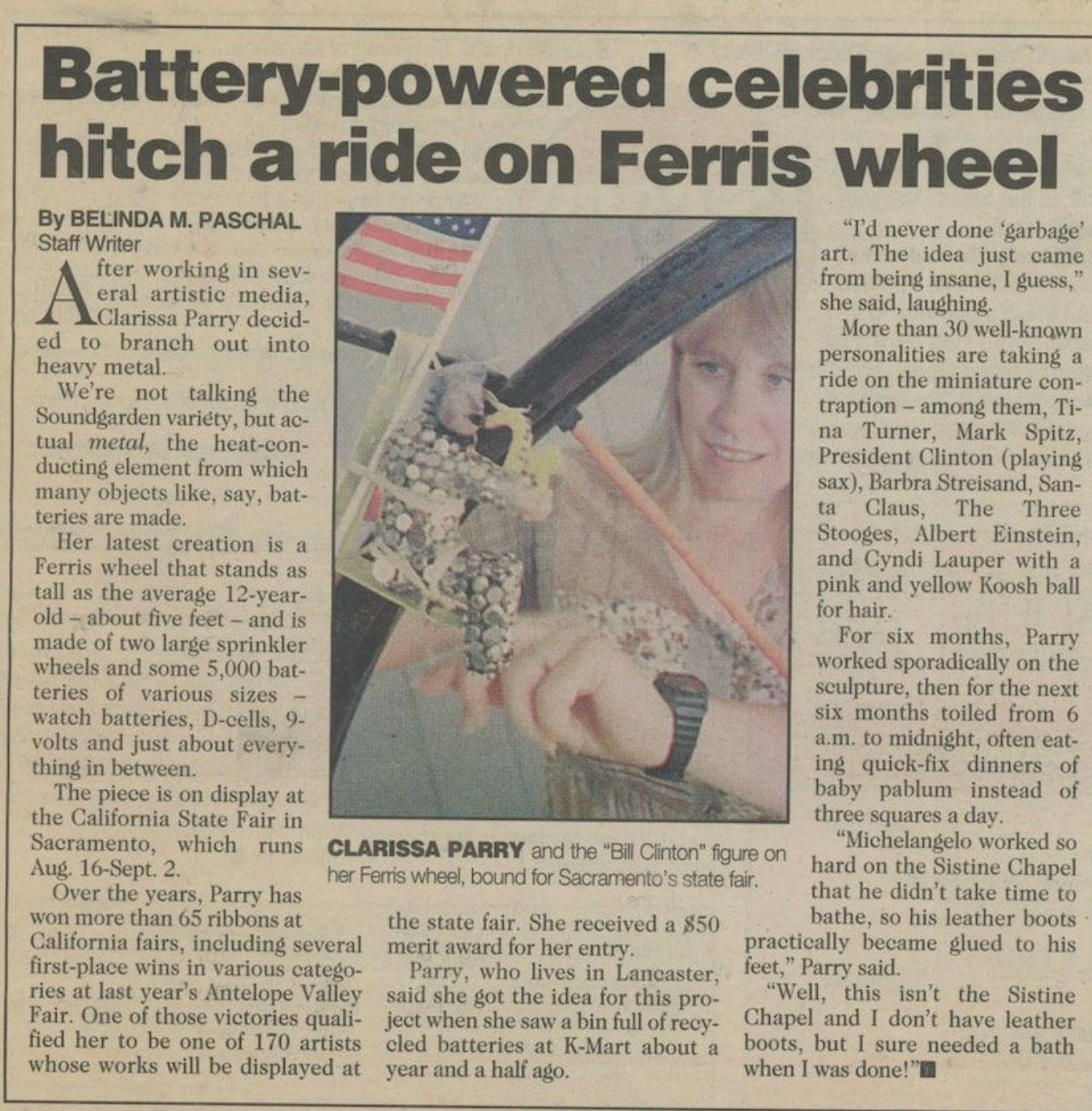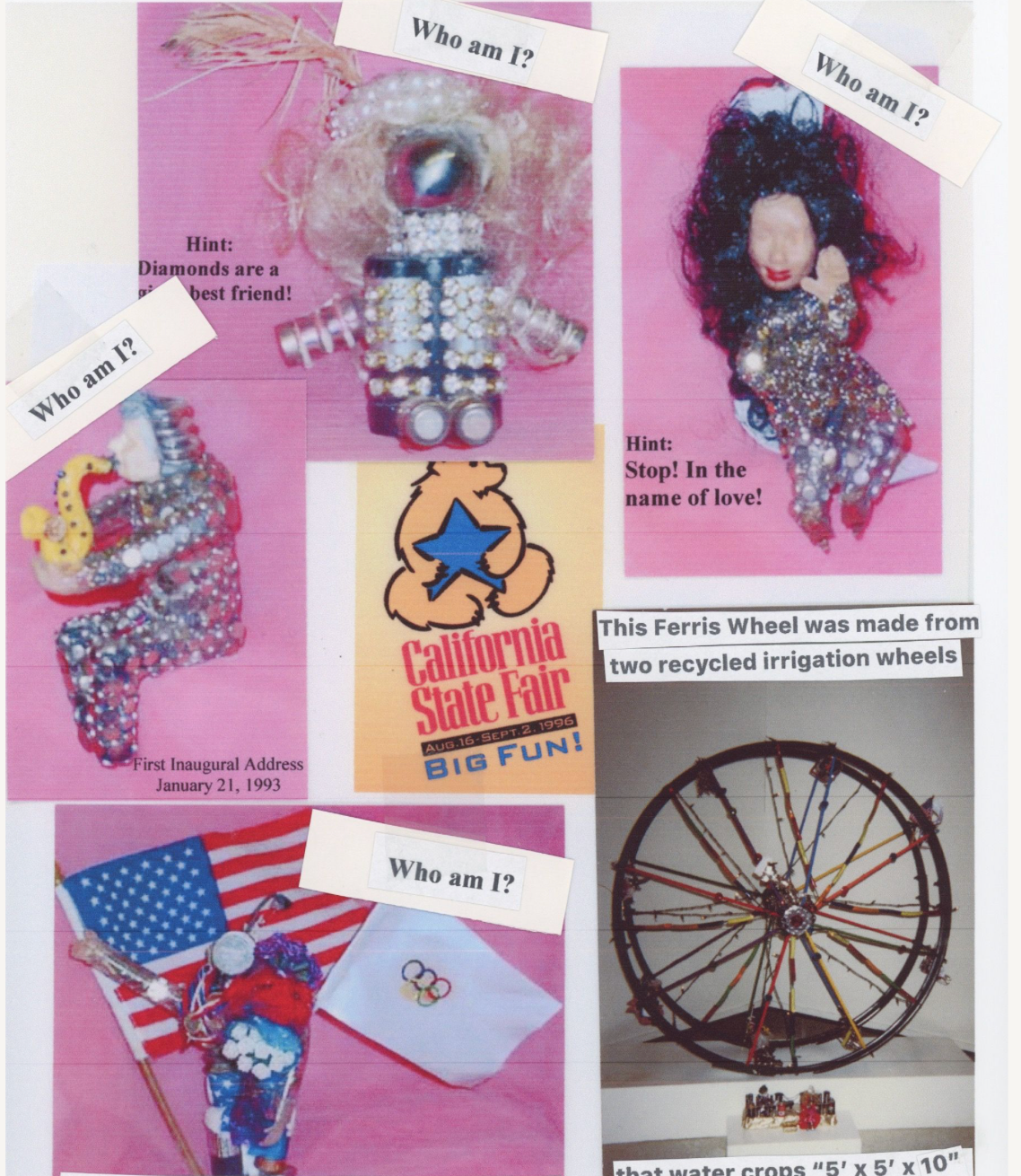This piece was a direct entry to the "California Works Exhibit," specifically the recycled division with the theme of the 1996 California State Fair, "Big Fun," included in the name of the piece. There were 1,150 entries and only 170 were selected for display in the exhibit. Over the years I had many friends bring items to my house that they just couldn't throw away, thinking surely I, as an artist, could create a piece of art. While in Blythe California, a metal engineer brought an empty metal spool that had held very expensive wire for his machine shop and said, "I can't throw this away, it's yours to do something with it." Later that summer while driving from Blythe to Redding, California, we stopped at a Kmart for some snacks and walked by the jewelry section where they had a cylinder full of old watch batteries. I asked the clerk what they were going to do with all those watch batteries—this was long before recycling was happening at disposal sites—and she said they were just going to throw them away. I asked if I could have them and she reached over and gave me the whole cylinder full. There must have been 3,000 watch & hearing aid batteries of all sizes. I used the metal frame that was given to me and shaped all these batteries into famous little people, making a very small Ferris wheel that won 1st Place. It was about 20 inches in circumference. When we moved from Blythe, California to Lancaster, California, I requested the California State Fair catalog and discovered there was a recycling section for the Fine Arts. Like many artists, I wanted to see if I was really an Artist, so I designed another Ferris Wheel from two giant irrigation wheels used in commercial fields where they grow alfalfa and other food items. I made more little people to go on the huge Ferris Wheel and created designer clothes for them. It has always been super fun for everyone to try and guess who the famous celebrities were. The Award of Merit received at the 1996 California State Fair/California Works Exhibition was a special honor—a prestigious recognition given to outstanding entries that go above and beyond standard ranking ribbons. Out of 1,150 people entering, with only 170 selected for display, receiving this top-tier award was an amazing achievement that confirmed, “Yes, I am a real Artist!”