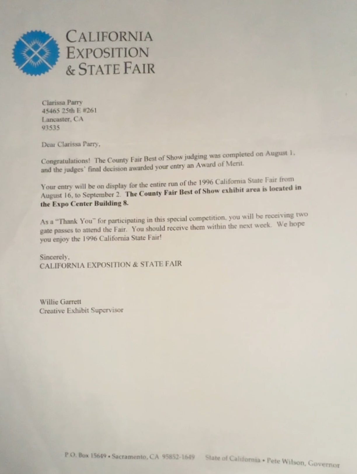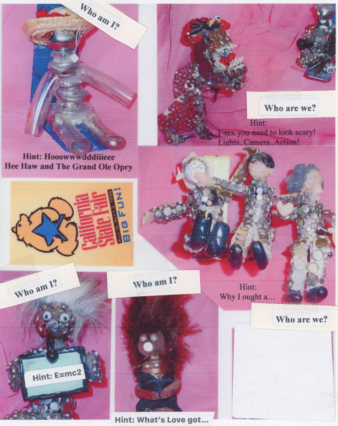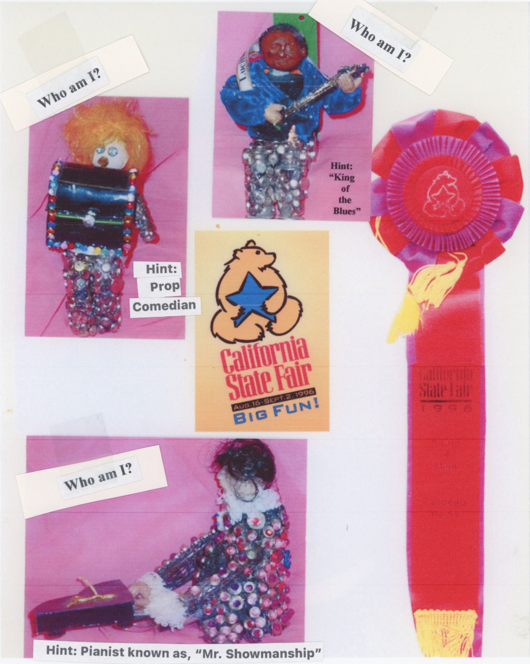 This piece was a direct entry to the "California Works Exhibit," specifically the recycled division with the theme of the 1996 California State Fair, "Big Fun," included in the name of the piece. There were 1,150 entries and only 170 were selected for display in the exhibit. Over the years I had many friends bring items to my house that they just couldn't throw away, thinking surely I, as an artist, could create a piece of art. While in Blythe California, a metal engineer brought an empty metal spool that had held very expensive wire for his machine shop and said, "I can't throw this away, it's yours to do something with it." Later that summer while driving from Blythe to Redding, California, we stopped at a Kmart for some snacks and walked by the jewelry section where they had a cylinder full of old watch batteries. I asked the clerk what they were going to do with all those watch batteries—this was long before recycling was happening at disposal sites—and she said they were just going to throw them away. I asked if I could have them and she reached over and gave me the whole cylinder full. There must have been 3,000 watch & hearing aid batteries of all sizes. I used the metal frame that was given to me and shaped all these batteries into famous little people, making a very small Ferris wheel that won 1st Place. It was about 20 inches in circumference. When we moved from Blythe, California to Lancaster, California, I requested the California State Fair catalog and discovered there was a recycling section for the Fine Arts. Like many artists, I wanted to see if I was really an Artist, so I designed another Ferris Wheel from two giant irrigation wheels used in commercial fields where they grow alfalfa and other food items. I made more little people to go on the huge Ferris Wheel and created designer clothes for them. It has always been super fun for everyone to try and guess who the famous celebrities were. The Award of Merit received at the 1996 California State Fair/California Works Exhibition was a special honor—a prestigious recognition given to outstanding entries that go above and beyond standard ranking ribbons. Out of 1,150 people entering, with only 170 selected for display, receiving this top-tier award was an amazing achievement that confirmed, “Yes, I am a real Artist!”