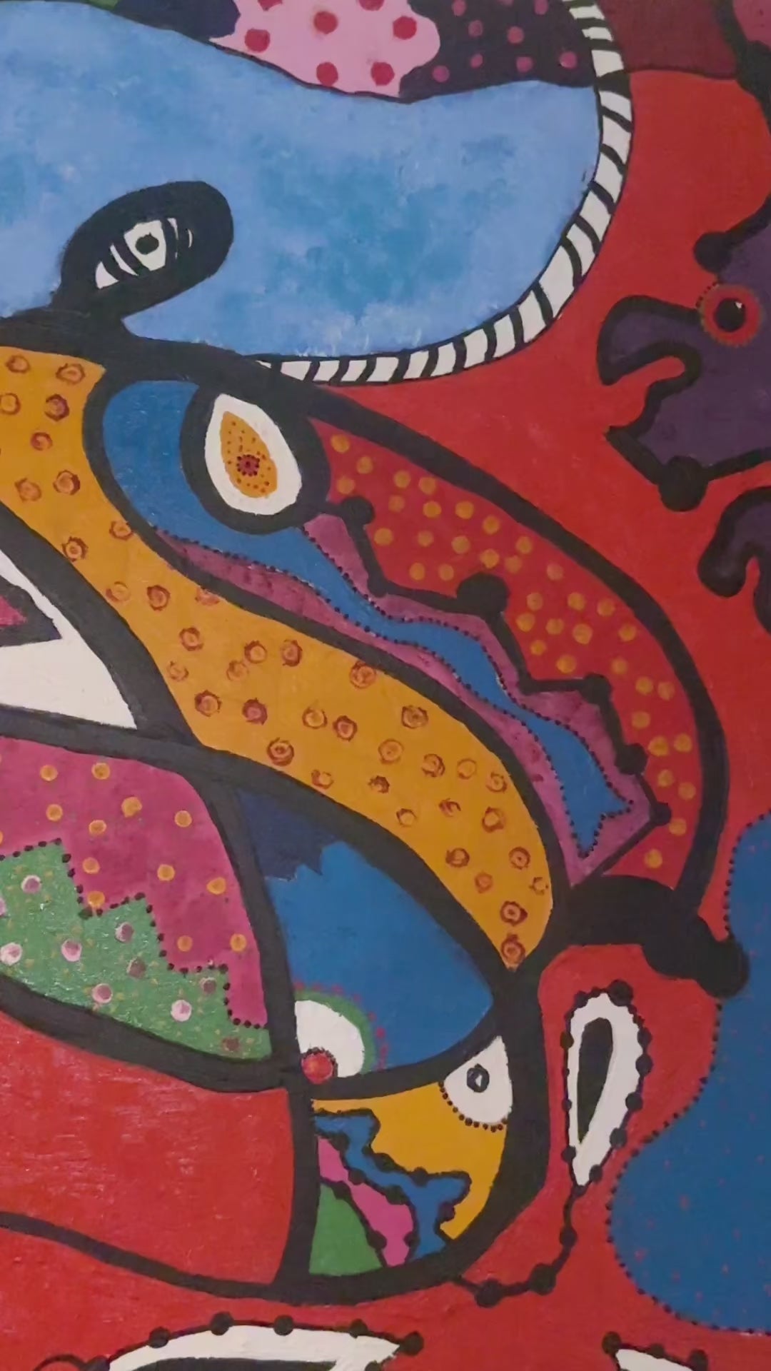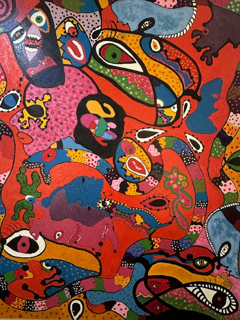 An interesting note here in 1997, it had been several days after we had sent our slides into The California State Fair, for Clarissa's, "Faces of War I," and Vanessa's, "Less Than 24," when people started asking, why did we paint all those faces in both of our pieces? We said, what faces? We had no idea at all of all the faces that we had painted in our two California State Fair entry pieces! There are about 12 faces in Clarissa's, "Faces of War I," and about 5 faces in Vanessa's, " Less Than 24." In our first try to collaborate the Faces, we intentionally put faces in, "Faces of War II," where put 11 faces, that were selected faces from "Faces of War I and "Less Than 24." There are about 33 faces in, "Faces of War III."
