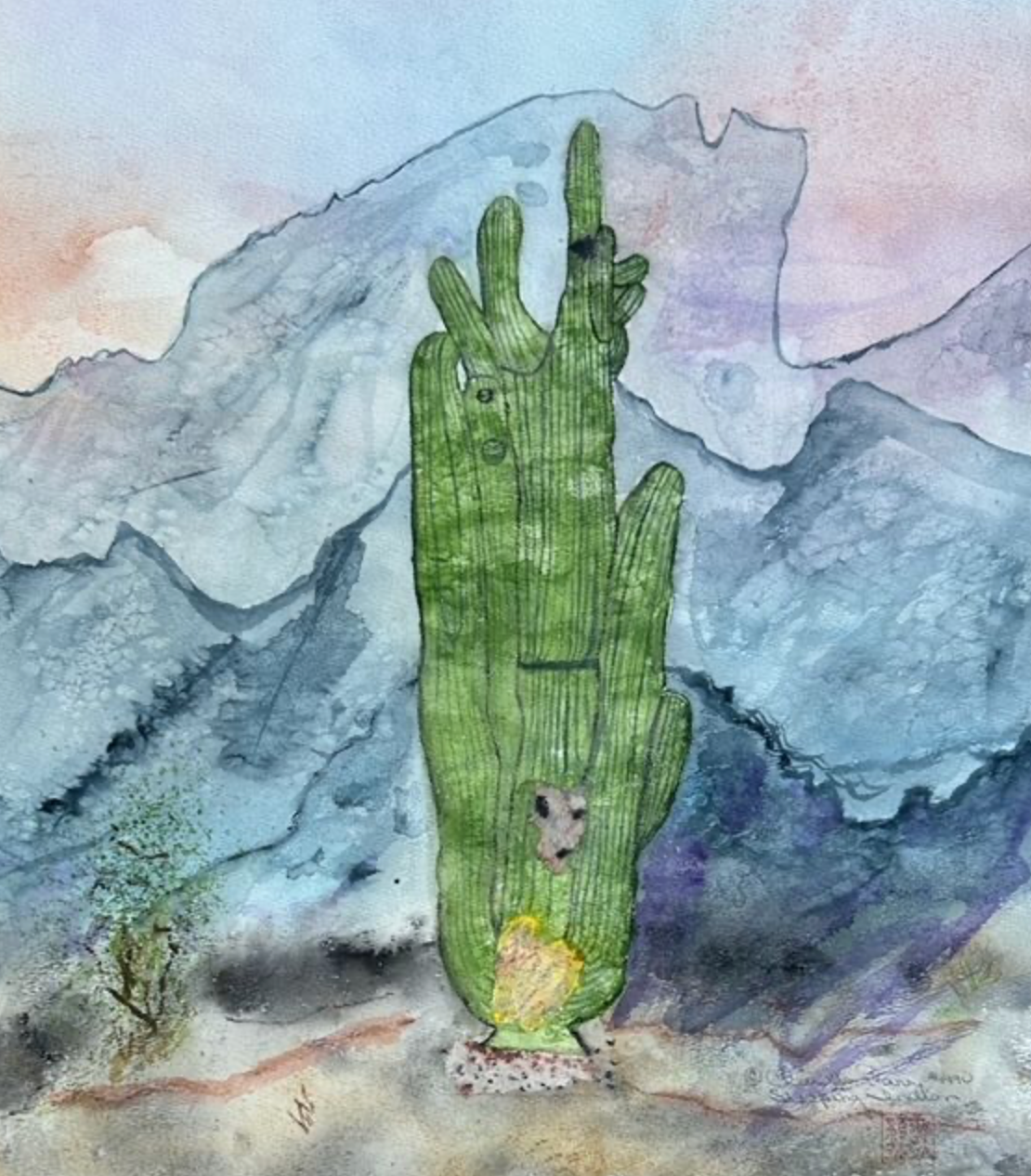 The soft watercolor washes in purples, blues, and earth tones capture the serene, contemplative mood of this sacred desert space. The Saguaro, with its distinctive arms reaching skyward, appears almost human-like, echoing the anthropomorphic qualities of the Sleeping Indian formation itself. This piece invites viewers into a meditation on time, endurance, and the profound spirituality found in America's Southwest desert landscapes.